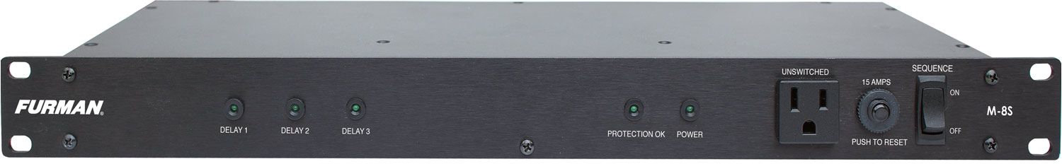 Install an M-8s in to the top slot of your rack, and the six delayed outlets in the rear panel will power up sequentially and protect all your equipment up to a 15-amp load. Includes 3 delayed outlet banks - each with 2 outlets - plus 2 unswitched outlets.Read More